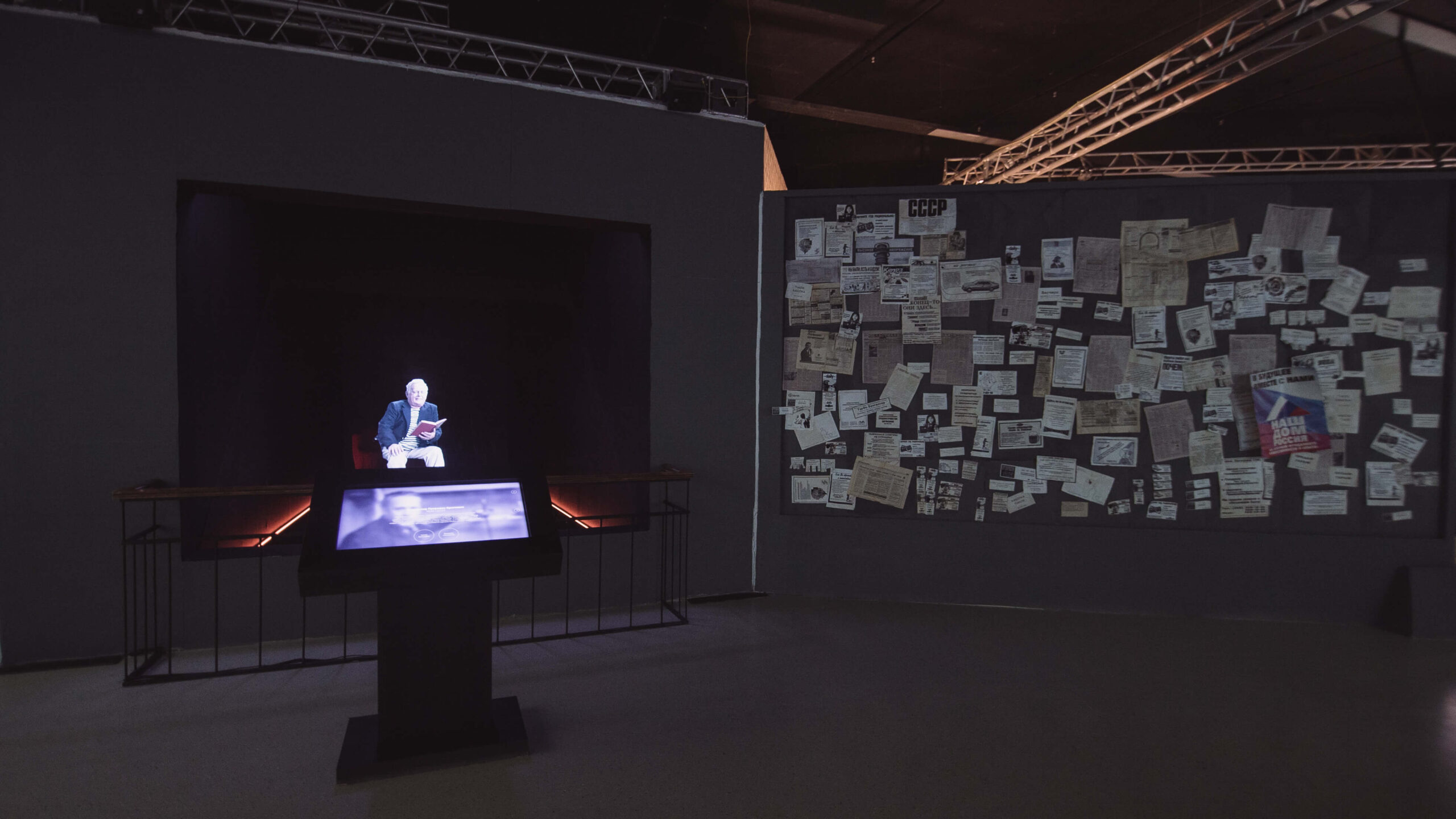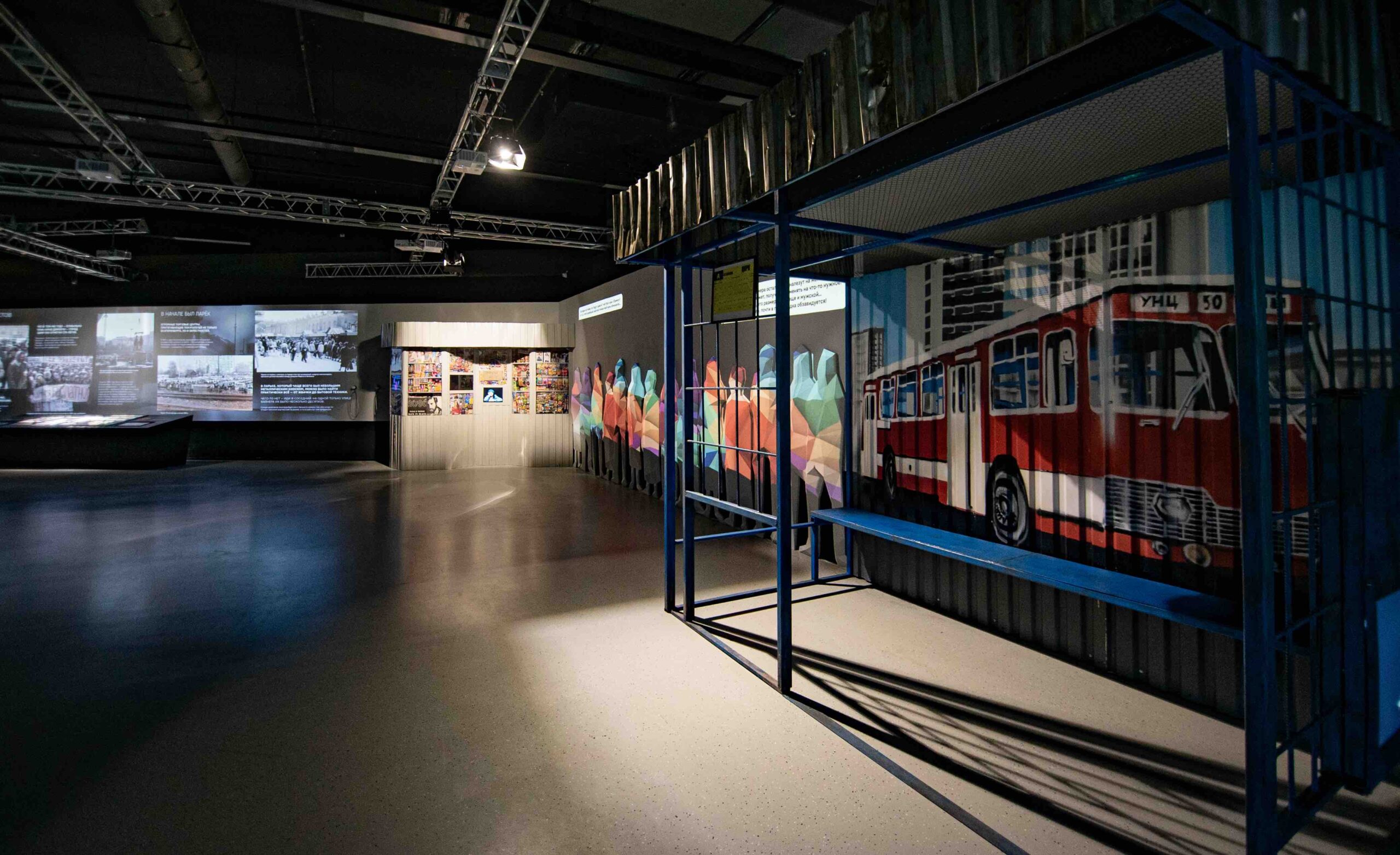 - Полноразмерные аналоговые декорации и арт-объекты:афишная тумба Морриса, остановка, ларек и комната девяностых позволят окунуться в эпоху и сопоставить свой быт с прошлым.